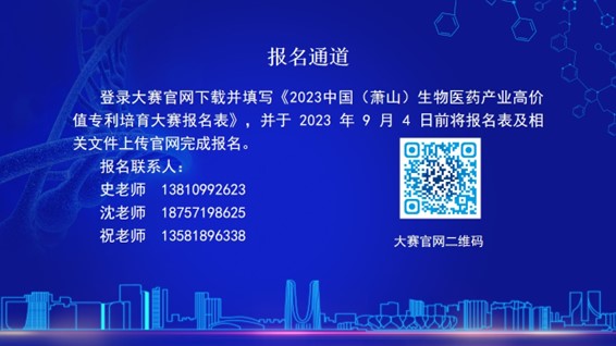 根据大赛组委会的赛程安排,即日起至2023年9月4日进行项目征集,参赛团队可搜索 “中国(萧山)生物医药产业高价值专利培育大赛” 登陆大赛官网下载《2023中国(萧山)生物医药产业高价值专利培育大赛报名表》进行报名。